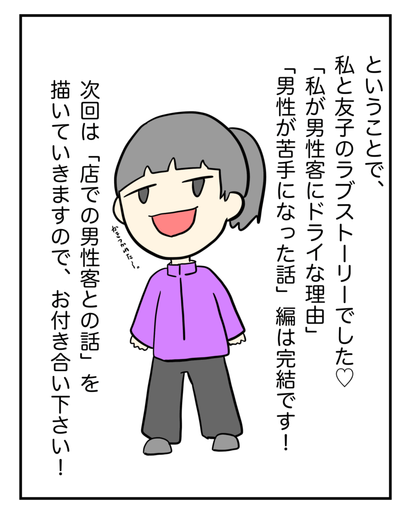 「男ドラ」〜男性が苦手になった〜⑧ 私が男性客にドライな理由 Twitter Facebook はてブ Pocket LINE コピー 2025.10.202025.03.24 スポンサーリンク 「男性が苦手になった」編、終了 簡潔に言いますと、小学生時代に痴漢にあったことが、男性を苦手になったきっかけです