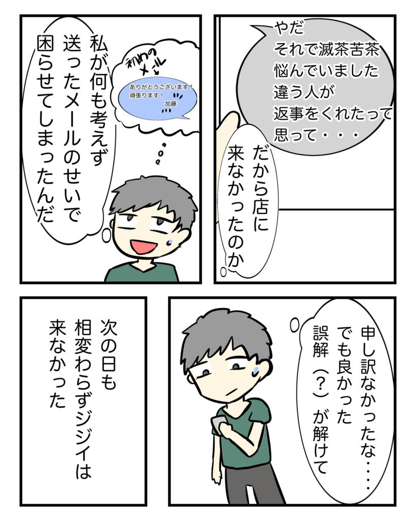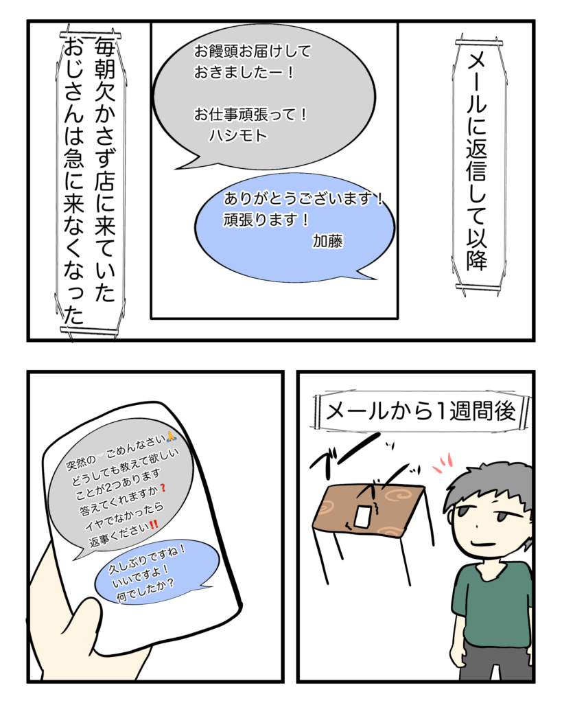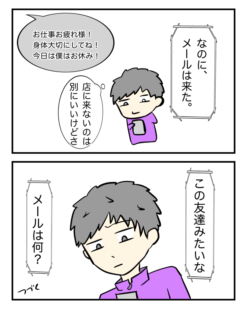 ~男ドラ~「店での男性客との話」Part1④ 男性客との話Part1 Twitter Facebook はてブ Pocket LINE コピー 2025.12.02 スポンサーリンク 相手のメールの文の最後に「ハシモト」って入れてたから、自分も真似して偽名を使うという、しょうもないジョークを入れたつもりが、パニクらせちったみたい